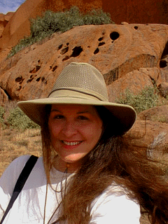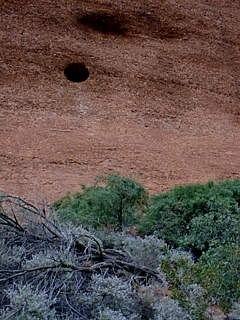 Okay, so my pictures look exactly like everyone else's pictures, but the experience was unique just the same. Really impressive, awe-inspiring big ol' rock :) It takes your breath away, the enormity of it. It's a single rock, actually the peak of a buried mountain (it's supposed to extend more than 10,000 ft. below the earth's surface), and is 5.5 miles around its base. The surface is pockmarked with caves, ridges, crevices, and ravines, each of which has a Dreamtime story attached to it. On the south side, the indentations in the rock are where spears scored in it a battle between the poisonous snake people, the Leru, and the sleeping lizard people, the Loongardi.One of the geologic sites is a pattern known as "The Brain" (looks like one, too), sacred to the local Pitjantjatjara people.