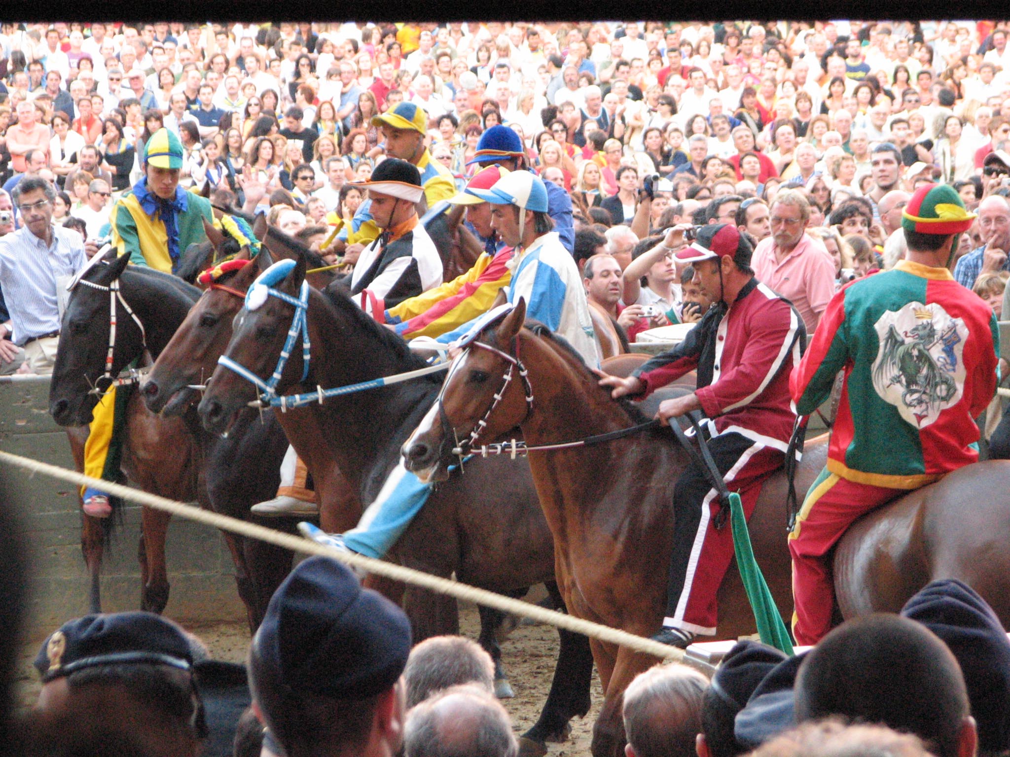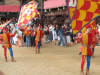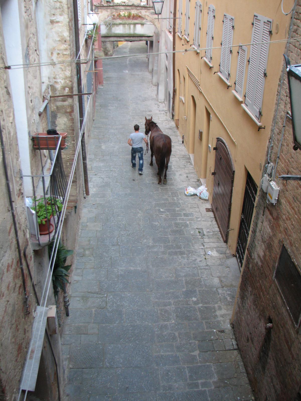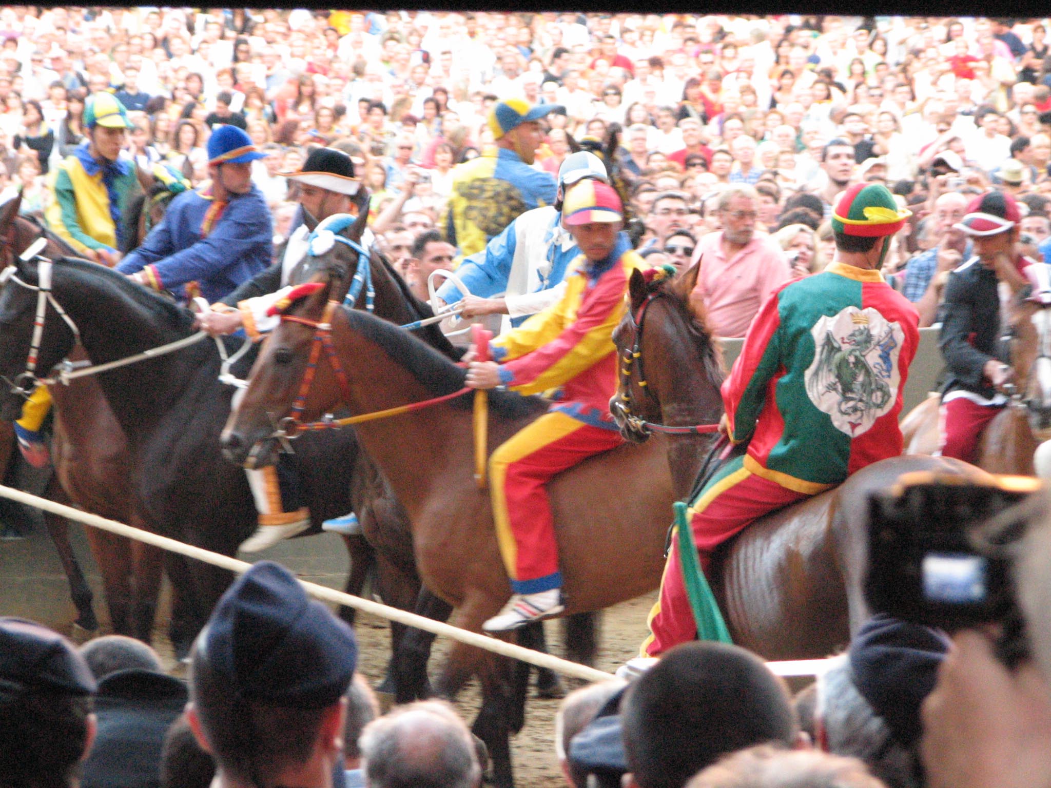 At around 7:30 pm, the horses started lining up between two ropes. Much care was taken to get the first nine into some indeterminate perfect order (the horses didn't want to cooperate, they bumped butts and kept turning around the wrong way and getting out of line, etc.) After countless fake starts and finagling and re-introductions and re-line-ups, suddenly the 10th horse came up from behind and as soon as he hit the first rope the second one was dropped and the race was on. Ninety seconds later, the Dragon horse had thrown its rider and bit the dust, and the gray horse (the Duck) won the match. The winning contrade (just across the street from us) burst into songs celebrating its greatness, the losers went off to cry in each others arms, the dragon horse showed up in the alley of Olé Olé! to snort and chuff and be hosed off of the blood he received in his tumble, and we searched the news in vain to find out what happened to the jockey he threw (still wondering by the way). No TV commentary during the entire match, although they replayed the 90-minute part over and over again.