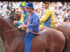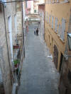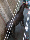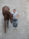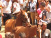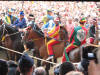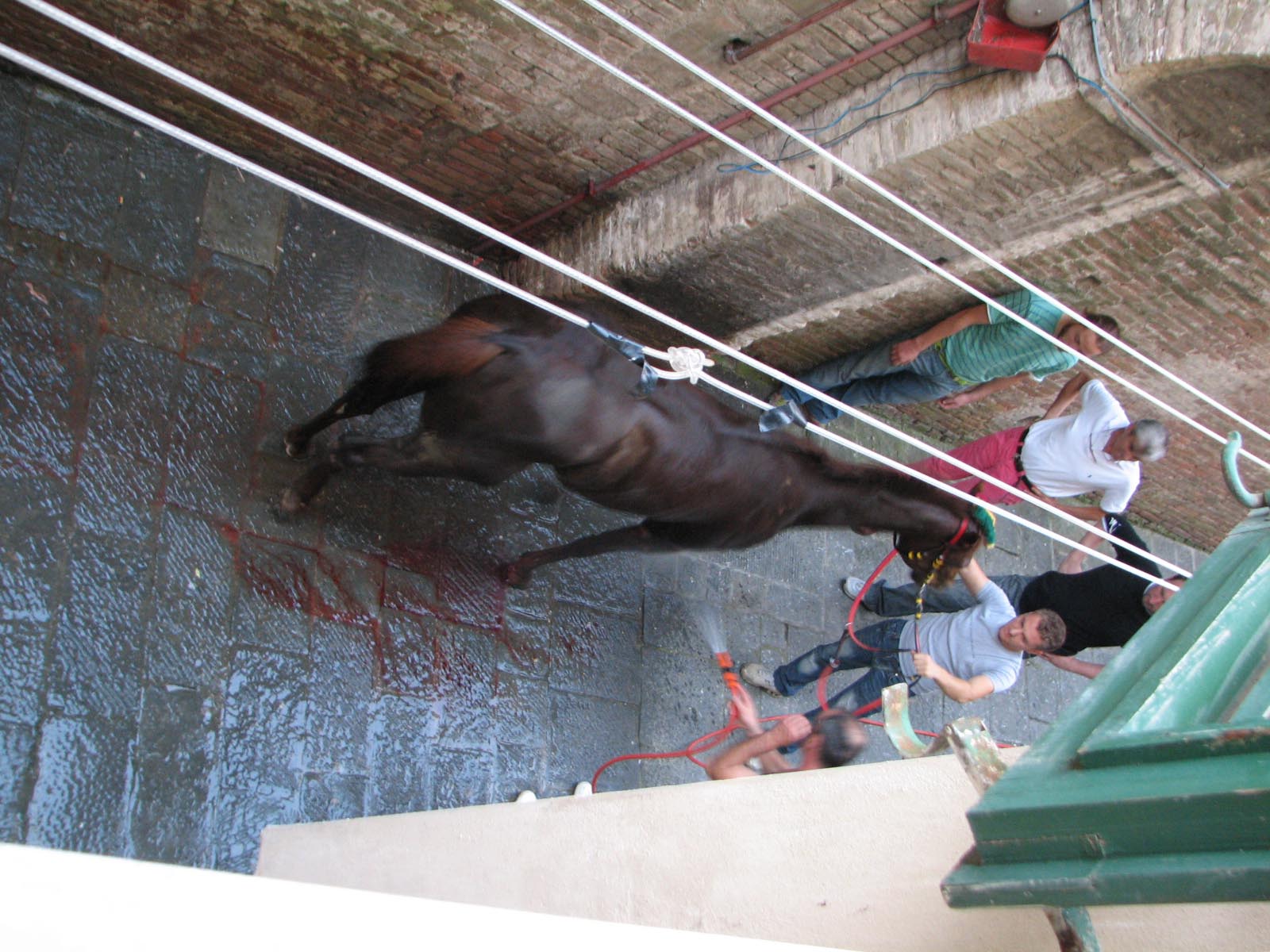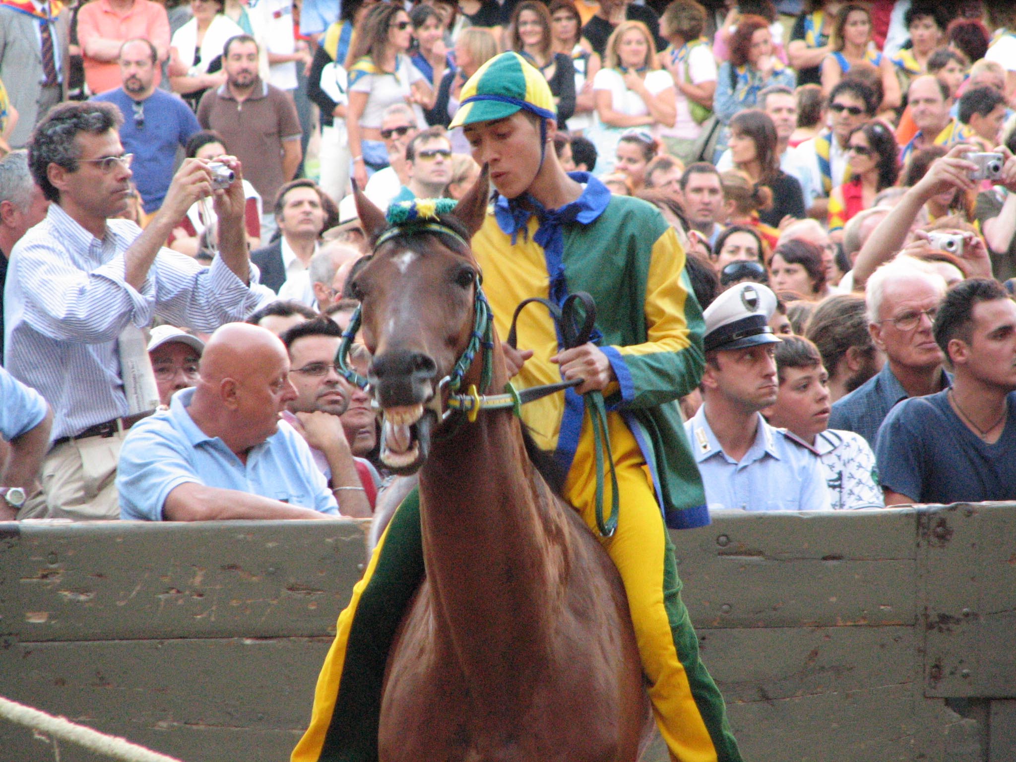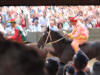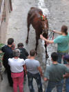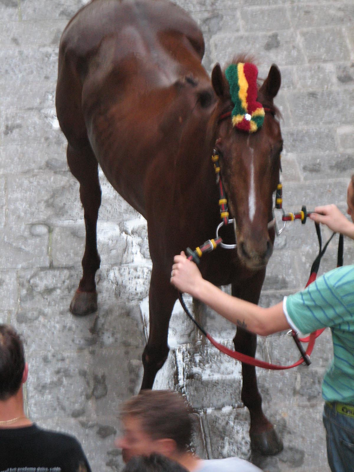 At around 7:30 pm, the horses started lining up between two ropes. Much care was taken to get the first nine into some indeterminate perfect order (the horses didn't want to cooperate, they bumped butts and kept turning around the wrong way and getting out of line, etc.) After countless fake starts and finagling and re-introductions and re-line-ups, suddenly the 10th horse came up from behind and as soon as he hit the first rope the second one was dropped and the race was on. Ninety seconds later, the Dragon horse had thrown its rider and bit the dust, and the gray horse (the Duck) won the match. The winning contrade (just across the street from us) burst into songs celebrating its greatness, the losers went off to cry in each others arms, the dragon horse showed up in the alley of Olé Olé! to snort and chuff and be hosed off of the blood he received in his tumble, and we searched the news in vain to find out what happened to the jockey he threw (still wondering by the way). No TV commentary during the entire match, although they replayed the 90-minute part over and over again.