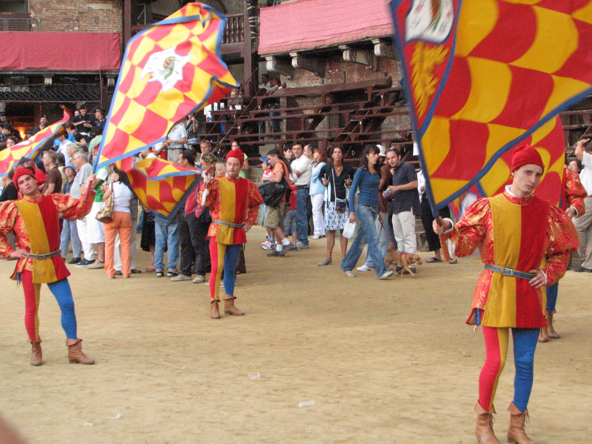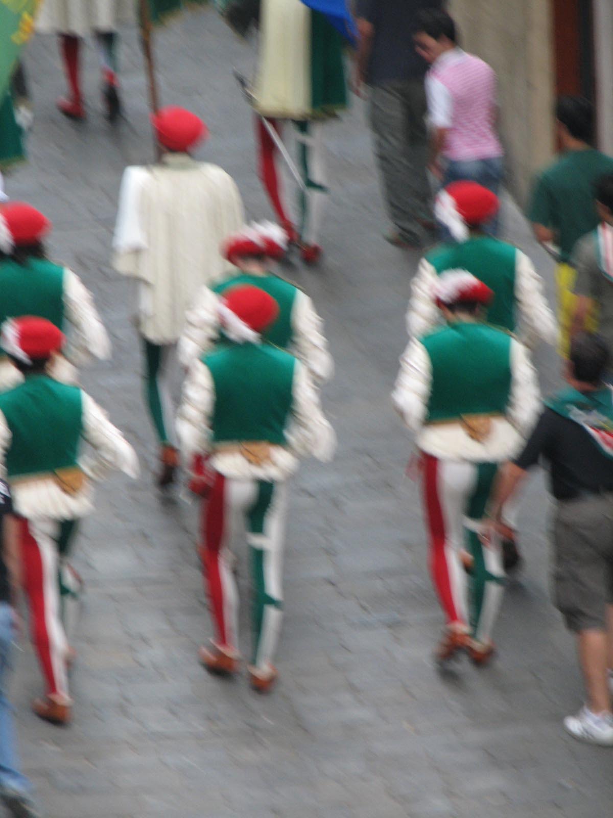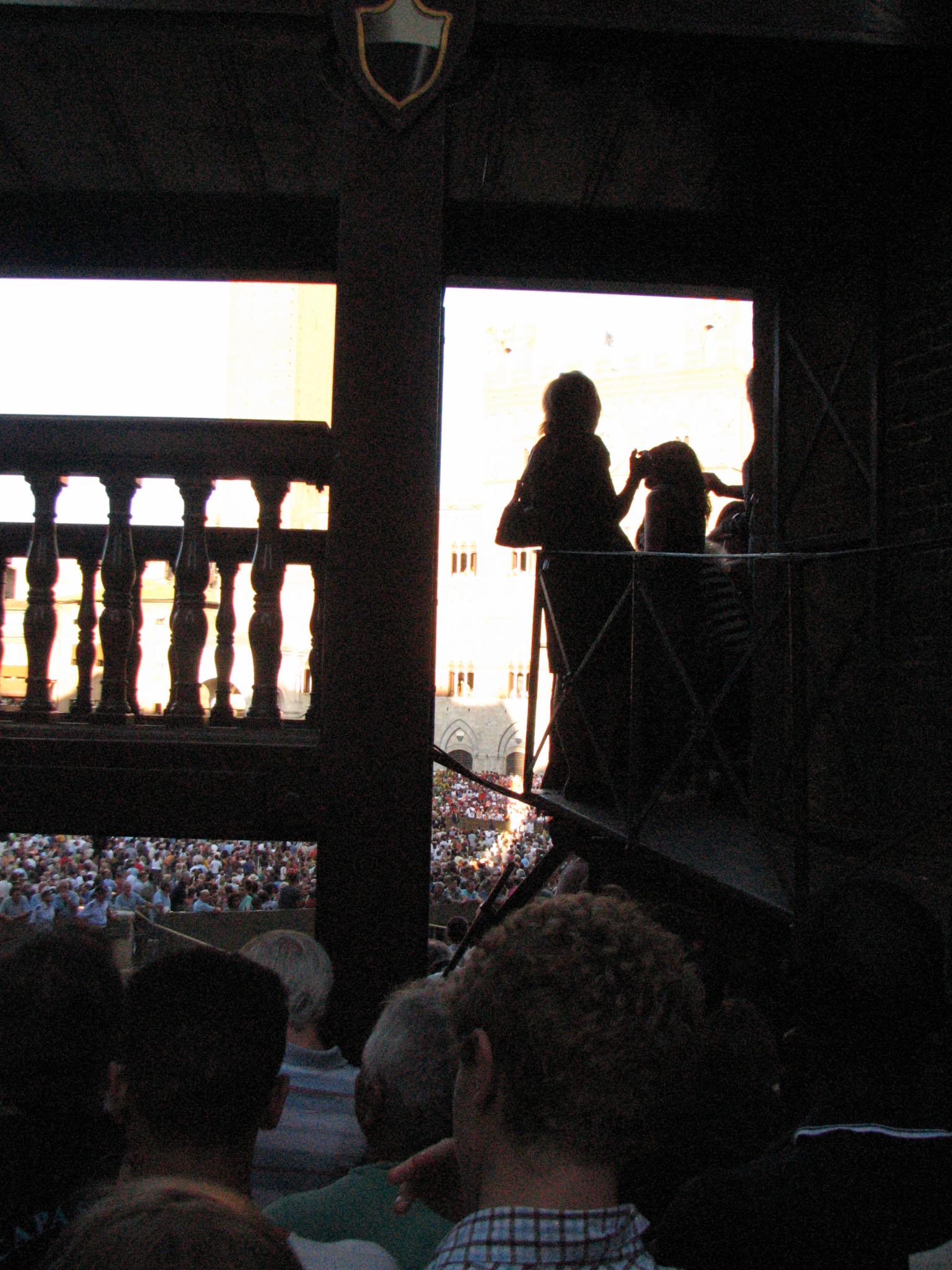They were rehearsing for the Palio (which is Monday), so they ran the horses in a rehearsal run, but there was a bit of a disaster. I couldn't really see much but bald spots and other people's cameras waving around, but apparently they didn't drop the ropes completely, and one of the horses went down and was trampled and chaos ensued. All we saw was the barriers coming down and a lot of crying people storming out. They wouldn't even tell us what was going on, and when we asked, simply said "Vaffanculo!" (F*** you!) Apparently one of the horses was out of commission after that, and one of the riders hurt his hand. They were angry with the mayor for not stopping the race immediately and everyone was in an uproar. Unlike a soccer match, an actual fight didn't break out (although we were secretly hoping for a little more action than actually took place, given the fact that we couldn't see anything going on.)