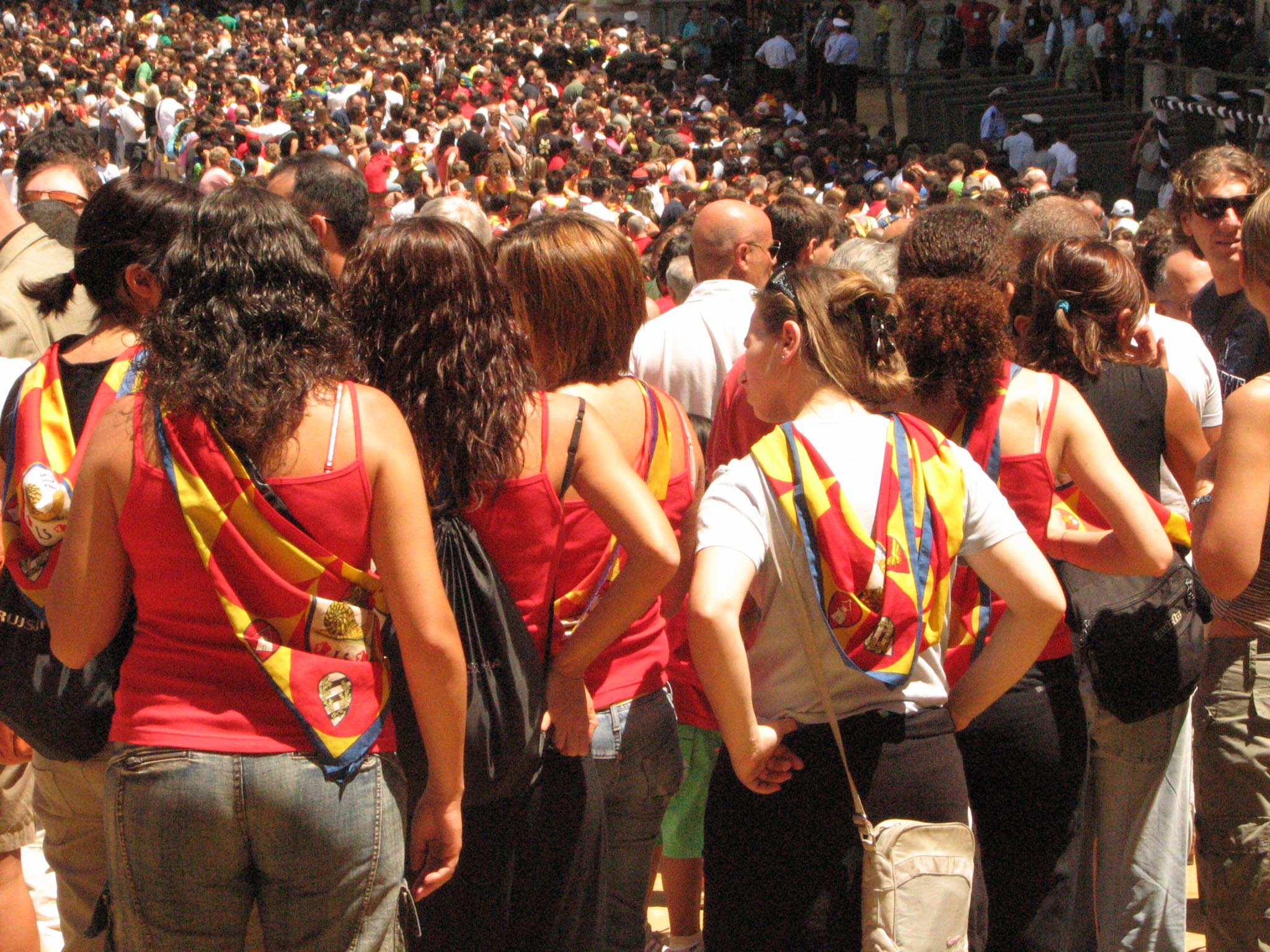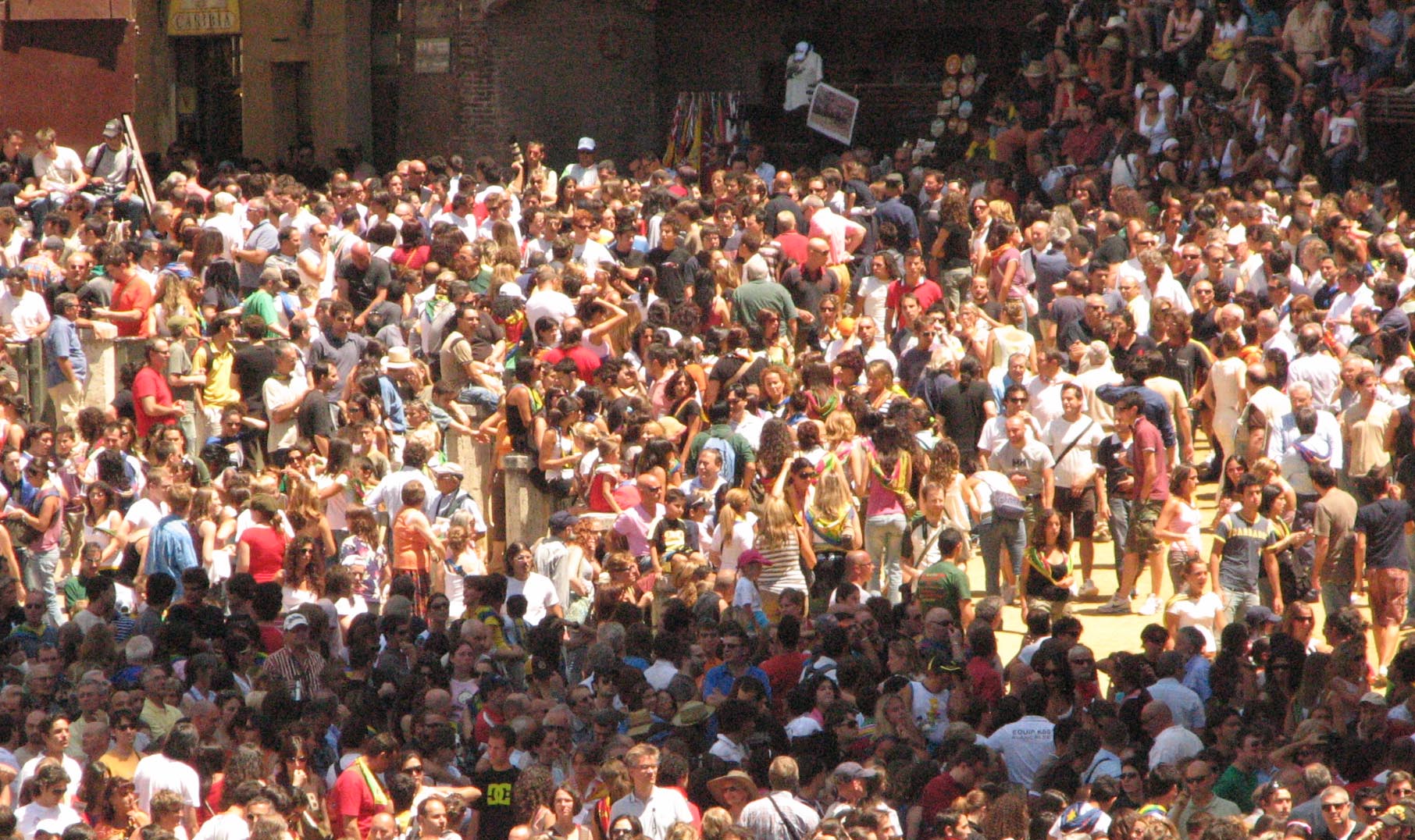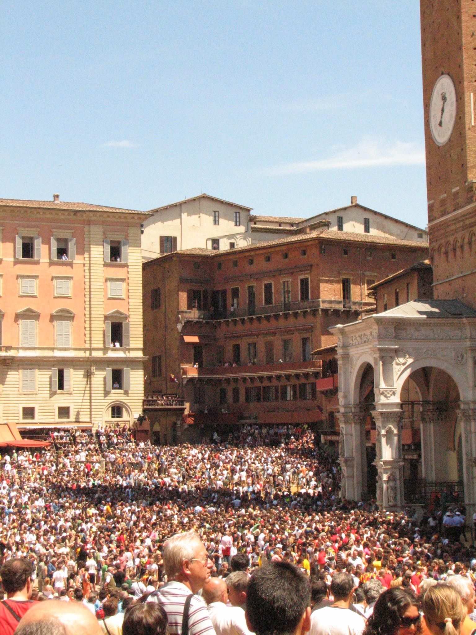 They were rehearsing for the Palio (which is Monday), so they ran the horses in a rehearsal run, but there was a bit of a disaster. I couldn't really see much but bald spots and other people's cameras waving around, but apparently they didn't drop the ropes completely, and one of the horses went down and was trampled and chaos ensued. All we saw was the barriers coming down and a lot of crying people storming out. They wouldn't even tell us what was going on, and when we asked, simply said "Vaffanculo!" (F*** you!) Apparently one of the horses was out of commission after that, and one of the riders hurt his hand. They were angry with the mayor for not stopping the race immediately and everyone was in an uproar. Unlike a soccer match, an actual fight didn't break out (although we were secretly hoping for a little more action than actually took place, given the fact that we couldn't see anything going on.)