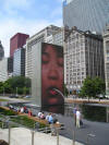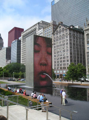 The Face Fountain is actually called the Crown Fountain, and is two 50-foot glass block towers at each end of a shallow reflecting pool, projecting huge video images of ordinary Chicagoans; water pours out of their mouths every few minutes, followed by a cascade of water from the top which sends the little kids at the foot of the pool squealing in all directions every time it goes off.