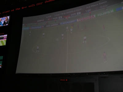 The next day, though, there was a line outside the ESPNZone at 10:45 -- LOTS of Italian fans with their red, green, and white hats and shirts and ITALIA stitched on their shirts. I kept my allegiances to myself...(!) Was seated in the same row as before, a few Laz-E-Boys down. I was hoping "Zizou" -- or "the Z-Man" as the press refers to him here -- would win during his last professional game. (Wes thought every time they said his name -- Zidane -- that they were saying "Saddam.") Go Zizou! The Z-Man! Go Saddam! Line and I agreed that midfielder Franck Ribery looked a little like the actor Nicolas Cage -- she'd emailed me to say, "Go Nico, get a goal!"