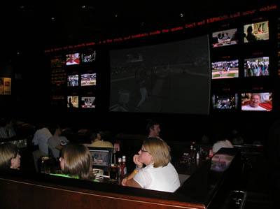 I went up to the restaurant/bar section, where I was seated right in front in a row of leather easy chairs with flip up feet with cup holders (holding ketchup bottles), a swing-around table with a recessed area for your drink, cloth napkins, real silverware. In front of me was an enormous hi-def screen, flanked by 12 video feeds, with MLB stats in red green and gold LCD and a large red sports crawl across the top. A woman named Tanya from Chicago was sitting next to me, waiting for the Sox game to start. The air was heavy with the smell of bacon and french fries and nachos -- it was like some kind of jock/ADHD paradise, junk food and beer at the snap of the fingers, and sports unspooling on thirteen screens in front of you.
