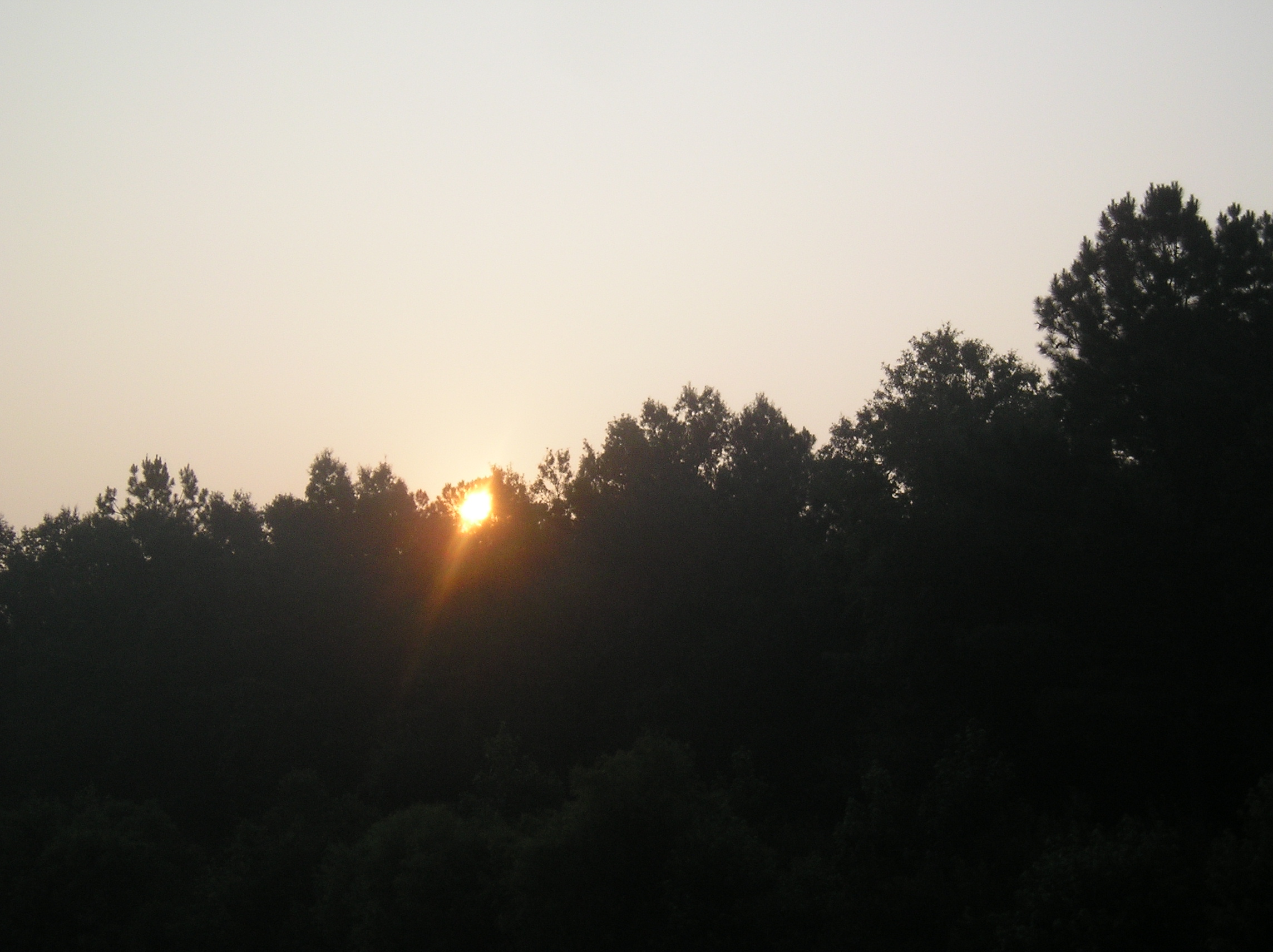 The sun coming up and peeping over the (almost certainly Georgia) pines: