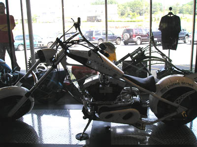 Made the sacred pilgrimage to Orange County Choppers where Keighley busted open her piggy bank to spend every last cent on clothes and memorabilia (photos to come when I get somewhere with a faster internet connection). The showroom/store was located in a strip mall with a wine-n-liquor store, Carmela's Italian restaurant, and a Chinatown Kitchen. Inside were the actual bikes built on the show -- the NASA Space Station Bike, the Santa Bike, the Lance Armstrong bike (but you could only look and not touch, and certainly not swing your leg over them and try Santa's bike on for size). We found the warehouse down the street where the actual work is done, too. By appointment only, the sign on the door said. I wonder how many thousands of people banged on the door before they put THAT sign up?